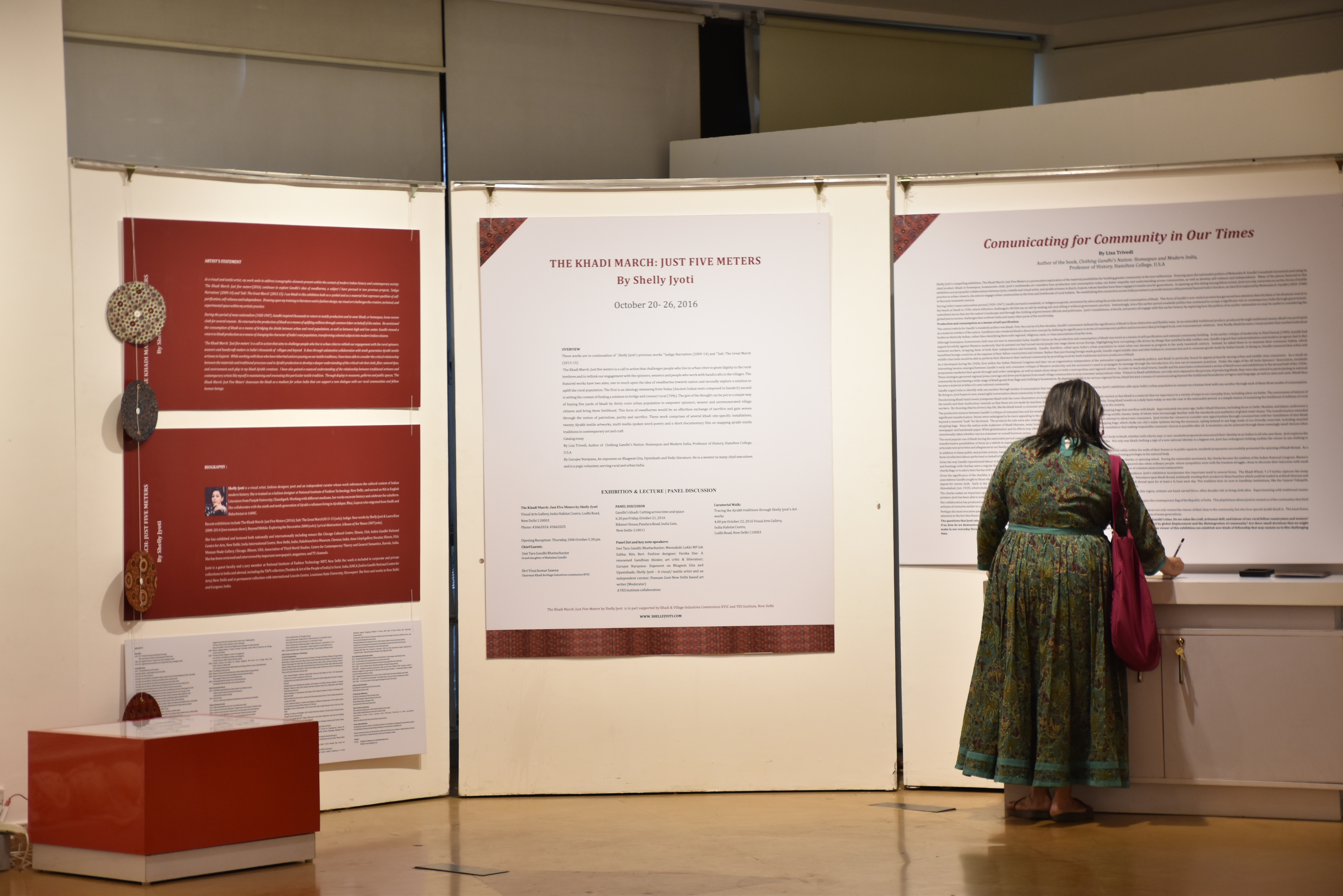 MAKING OF ‘THE KHADI MARCH: JUST FIVE METERS’ (2016)Smt Tara Gandhi Bhattacharjee for writing catalog foreword and sharing her poetry ‘Spinning wheel’ for the show; Prof Lisa Trivedi Hamilton, Professor of History, Hamilton College, U.S.A, Author of Clothing Gandhi’s Nation: Homespun and Modern India for the writing the catalog essay and peer review; Dr Alka Pande, Curator & Director of Visual Arts Gallery and her team; Shri Gurujee Narayana, an exponent on Bhagwat Gita and Vedic literature for writing the essay on Swadharma as catalog essay and his blessings; Poonam Goel-Personna; Audio recording Studio: Pindrop, Haus khas, New Delhi; Dishant Narang for lending his voice over for Multi media spoken word poetry and the documentary film; Ajrakh Artisans in Bhuj-Ashraf, Ishak Ali Mohamed, Juber Adam, Razak siddique; Master craftsman -Junaid Ismail M khatri; Photography: Inder Gopal, New Delhi; Khandelwal Interiors: Constructional finishes, New Delhi; Dress forms: Figurette INC kalkaji, New Delhi; Documentary work: Ridham D Chhatrala, Bhuj, Gujarat; Embroidery: Naintara, Savitri, Gudiya, Shefali; Construction and stitching of fashion: Suresh pattern master; Catalog publishing: Archana Press; Video editing: Creation Films, Lajpat Nagar, New Delhi; Publishing consultant: Vasundhara Sawhney Jyoti; Final year Textile Design students NIFT, New Delhi; Ashima Tshering, Installation & Spatial Design student at NID, Ahmedabad