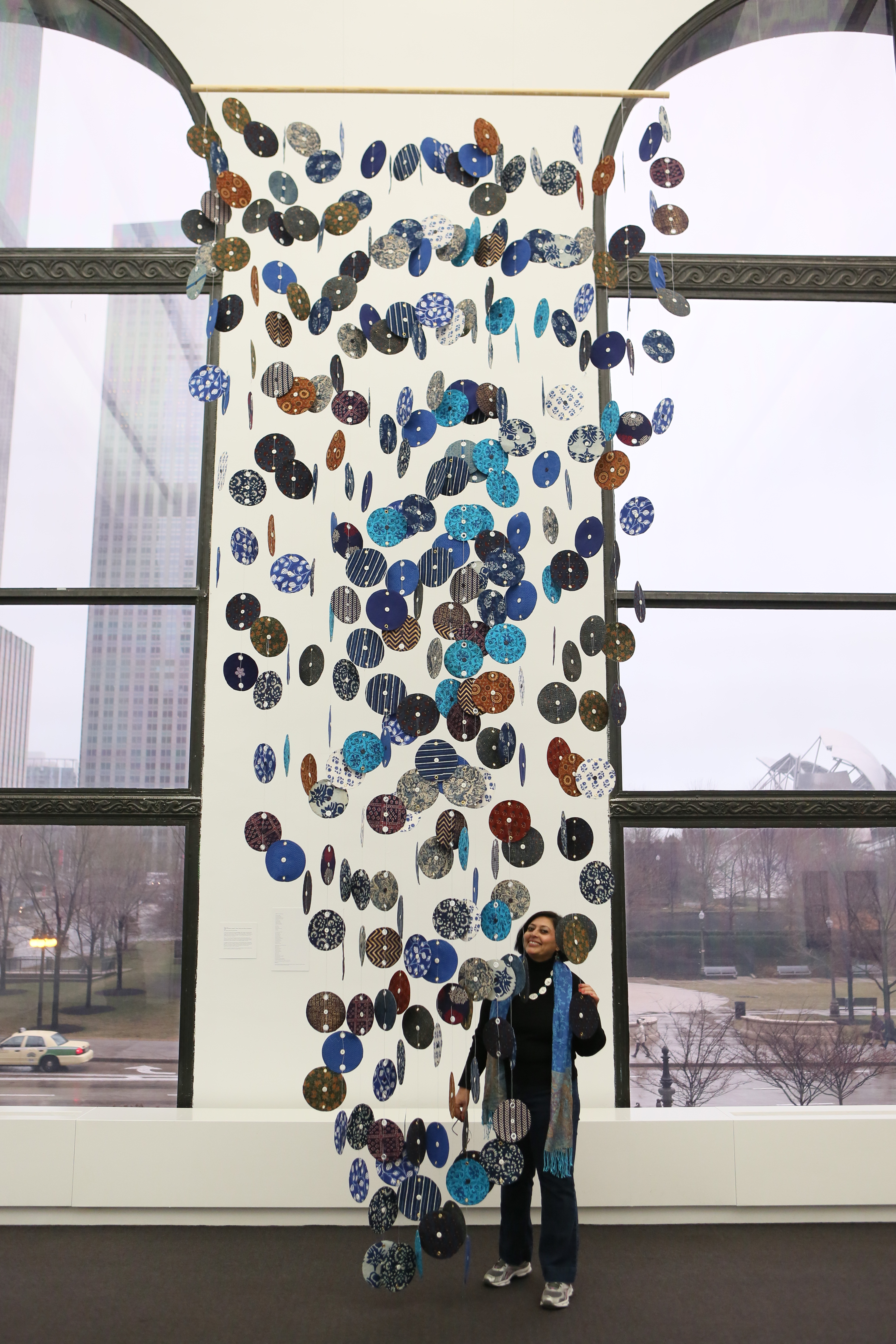 The 10ft high installation Homage :The tapestery of designs is a tribute to indigo farmers of champaran display printed disks of 7”diameter with sets of 15 different contemporary indigo print which maps the story of ryots of champaran suggesting of their sorrowful tales inscribed in each circle .There are 120 disks installated hanging attached one by another suggesting the hundreds of years of subjugation.